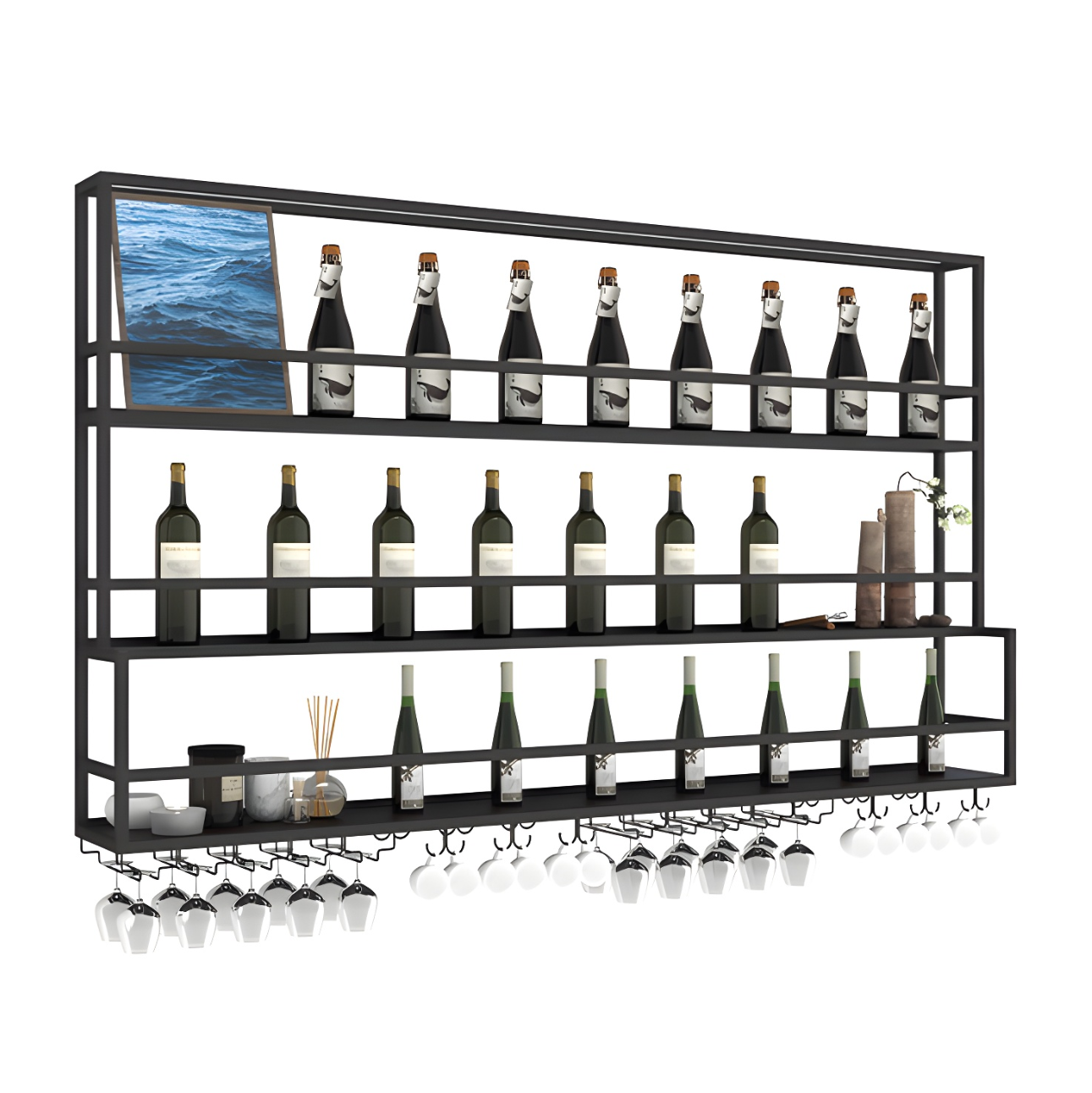 Black Floating Modern Wine Bottle & Glass Rack w/ Light - 200x25x121 cm